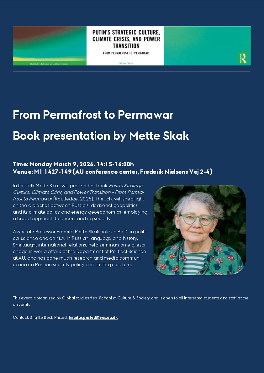 In this talk Mette Skak will present her book Putin's Strategic Culture, Climate Crisis, and Power Transition - From Permafrost to Permawar (Routledge, 2025)