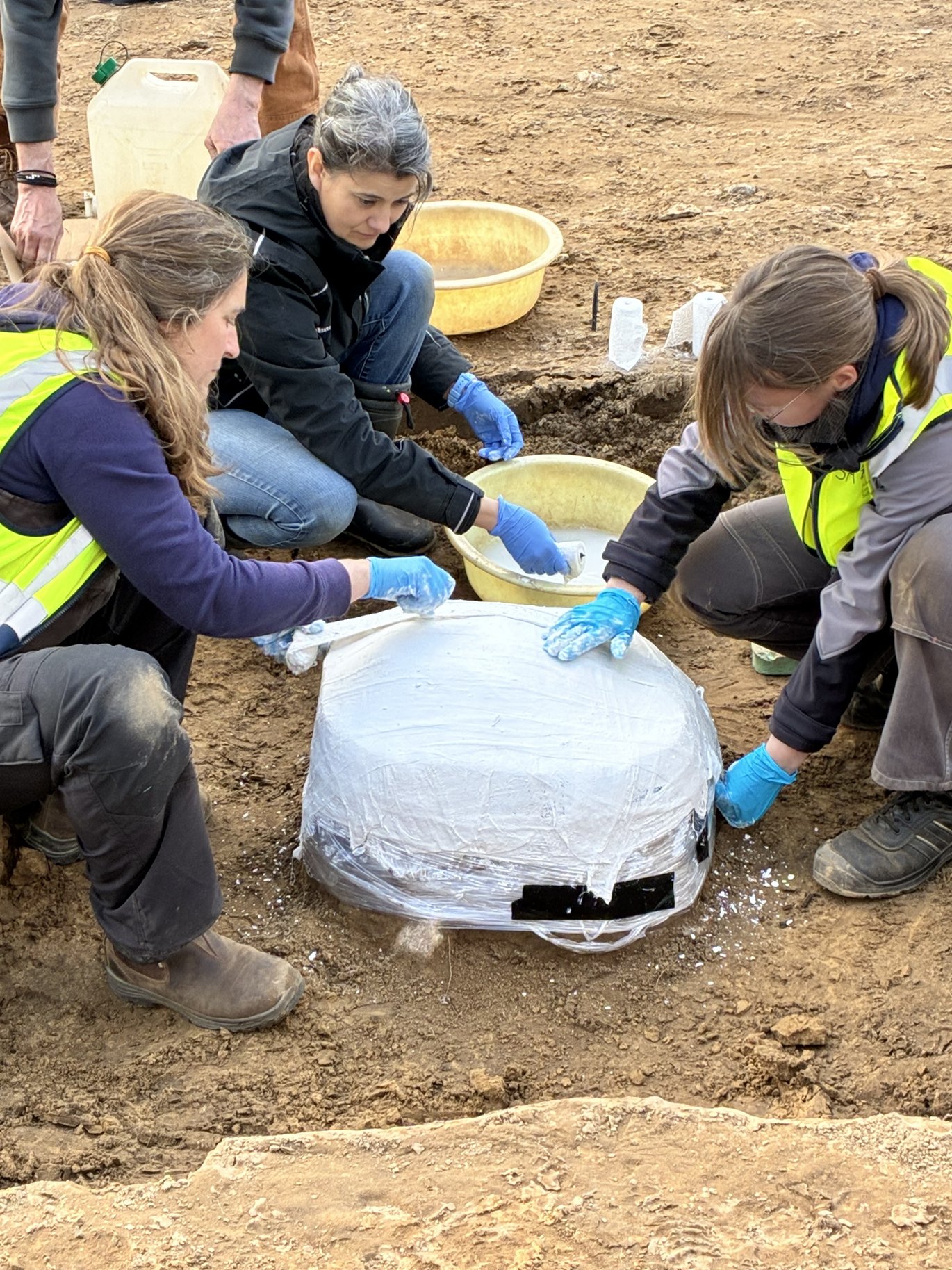 Fundene er i en skrøbelig tilstand og bliver derfor taget op som en samlet jordblok. Metoden indebærer, at arkæologerne først blotlægger overfladen og derefter forsigtigt graver sig ned omkring fundet, så det til sidst står på en sokkel af jord. Herefter bliver det pakket ind i plast og gips og løftet fri af jorden.