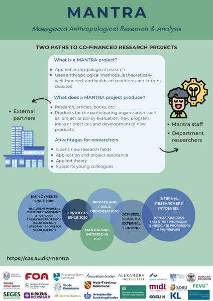 MANTRAs antropologer undersøger, udfordrer og nytænker aktuelle problematikker vedrørende menneskers kultur. Antropologiske studier er baseret på en kvalitativ, åben tilgang til menneskers samspil og levevis. Altid med et kritisk udefrakommende blik for forandrings- og forbedringsmuligheder, baseret på teori om menneskelig handling, organisering og sociale strukturer. Læs mere om MANTRA.