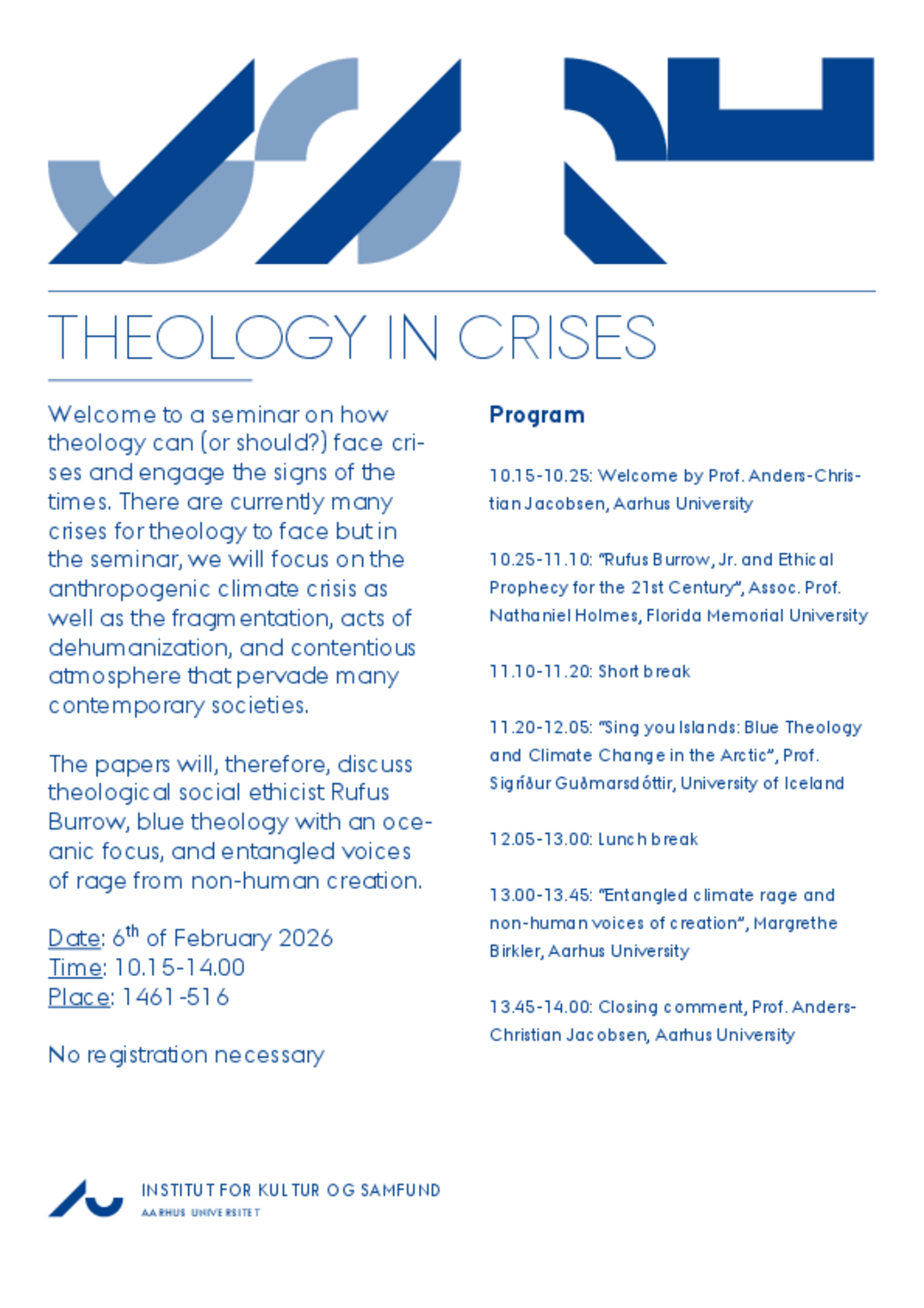Welcome to a seminar on how theology can (or should?) face crises and engage the signs of the times. There are currently many crises for theology to face but in the seminar, we will focus on the anthropogenic climate crisis as well as the fragmentation, acts of dehumanization, and contentious atmosphere that pervade many contemporary societies.