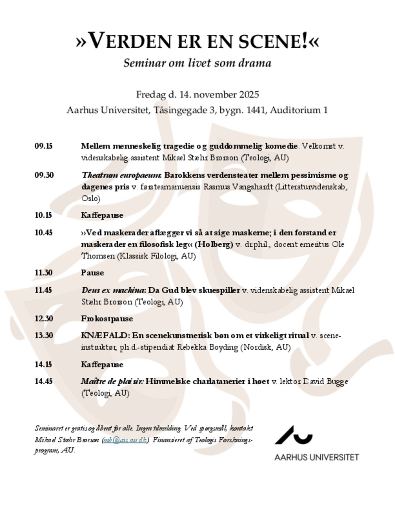 Åbent seminar om verdensteater – alle er velkomne! »Verden er en scene, hvor mænd og kvinder spiller deres roller«, siger Jacques i William Shakespeares "Som man behager". Men er det så en tragedie eller en komedie, vi spiller med i? Findes vores sande identitet bag masken – eller skal vi kende hinanden på masken? Og hvem er egentlig stykkets forfatter? På dette seminar mødes kunst og tænkning, når vi fra teologiske, litterære, idéhistoriske, filosofiske og kunstneriske vinkler skal undersøge menneskets vilkår på verdensscenen. Alle er velkomne, ingen forhåndstilmelding.