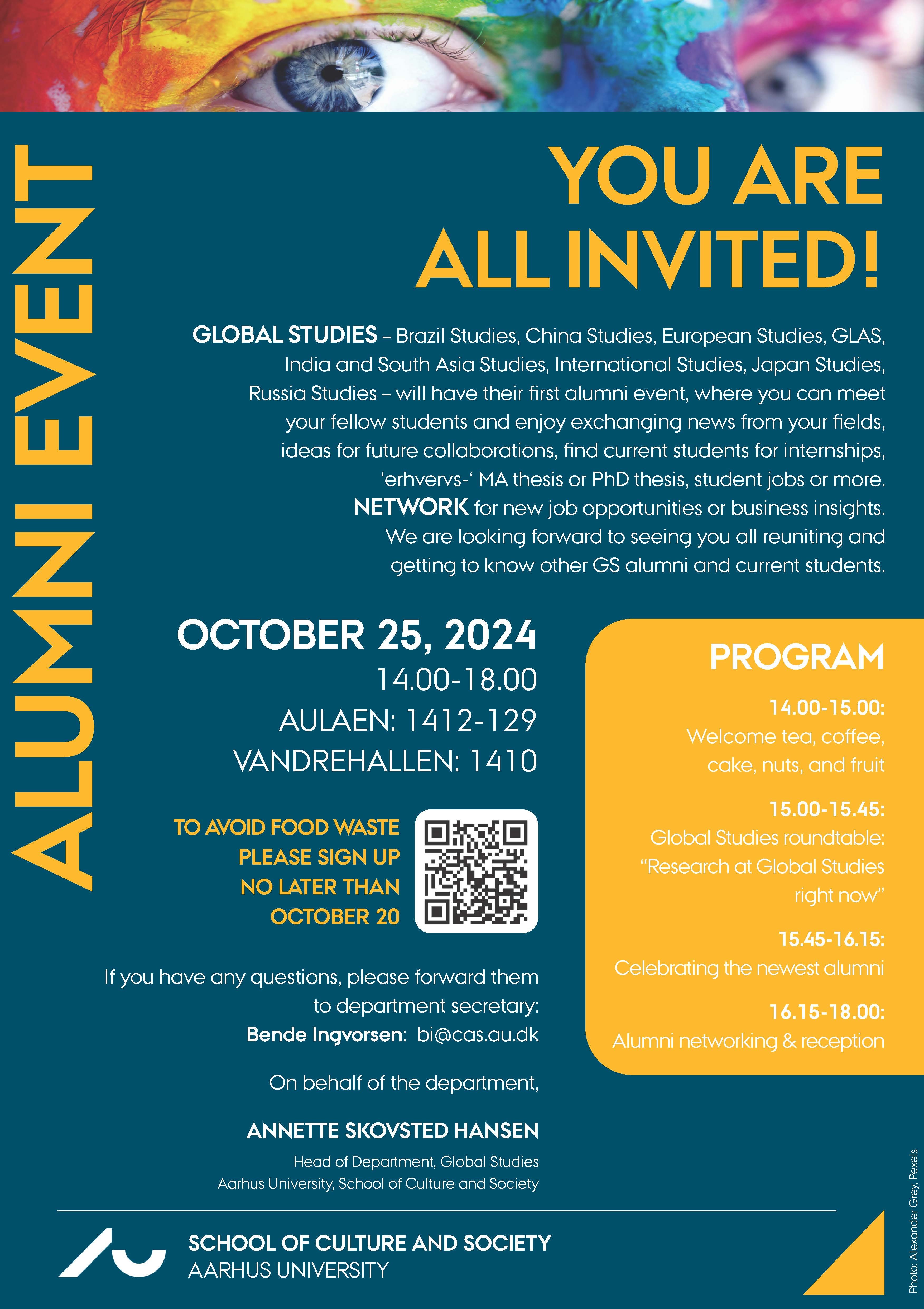 Brazil Studies, China Studies, European Studies, GLAS, India and South Asia Studies, International Studies, Japan Studies, Russia Studies – will have their first alumni event, where you can meet your fellow students and enjoy exchanging news from your fields, ideas for future collaborations, find current students for internships, ‘erhvervs-‘ MA thesis or PhD thesis, student jobs or more. NETWORK for new job opportunities or business insights. We are looking forward to seeing you all reuniting and getting to know other GS alumni and current students.