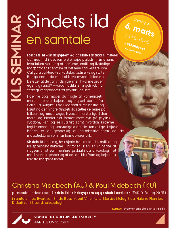 Far og datter - Poul Videbech (Institut for Klinisk Medicin Psykiatri, KU) og Christina Videbech (Klassiske Studier, AU) præsenterer deres bog "Sindets ild – sindssygdom og galskab i antikken" (FADL’s Forlag 2025) i samtale med Evert van Emde Boas, Arent Vihøj Kvist (klassisk filologi) og Malene Flensted Dideriksen (klassisk arkæologi)
