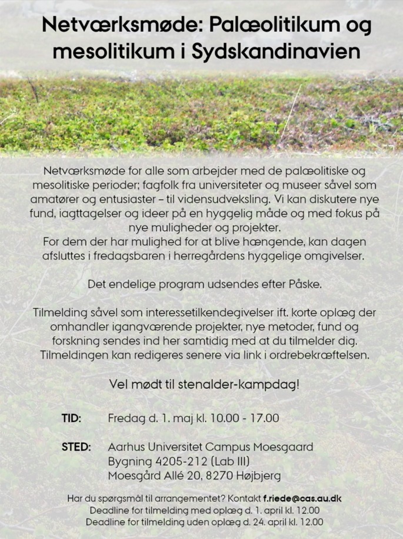 Netværksmøde: Palæolitikum og mesolitikum i Sydskandinavien Info about event Time Friday 1 May 2026, at 10:00 - 17:00 Add to calendar Location Aarhus Universitet, Campus Moesgård, Moesgård Allé 20, 8270 Højbjerg, Lab III (bygning 4205, lokale 212) Register